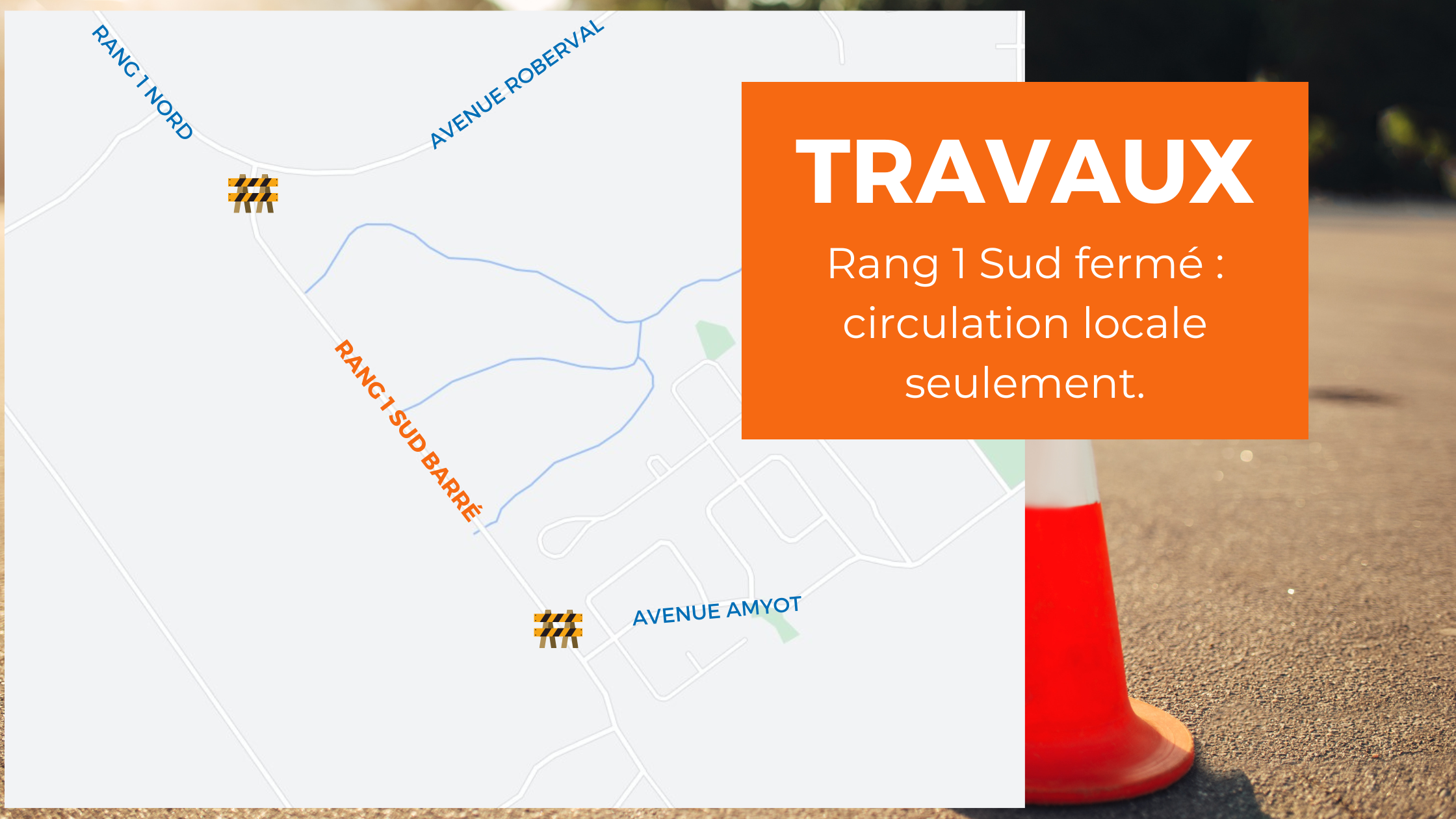 La réfection d'un ponceau principal entraînera la fermeture du Rang 1 Sud, entre l'avenue Amyot et l'intersection du Rang 1 Nord, à compter du 12 septembre, et ce, pour une période maximale de 4 semaines.