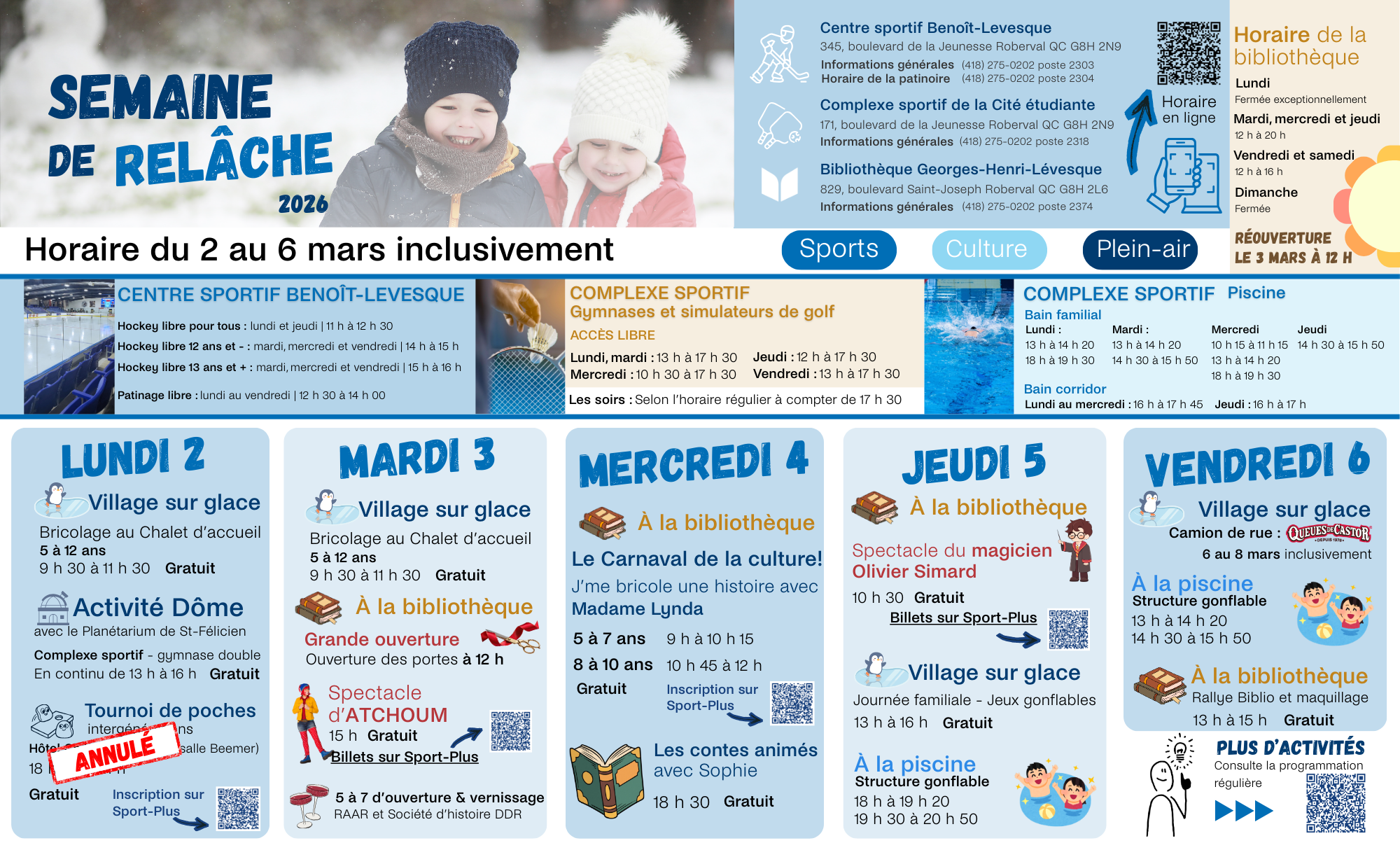 De plus, la semaine de relâche 2026 restera gravée dans la mémoire collective par la réouverture tant attendue de la bibliothèque Georges-Henri-Lévesque! Nous vous invitons à redécouvrir ce lieu rénové et agrandi!